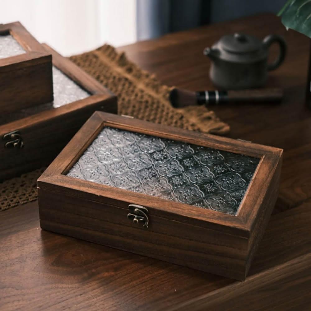 海棠壓花玻璃收納盒 桌上收納盒 木盒 飾品盒 首飾盒 置物盒 小物收納盒(復古窗花 收納盒)