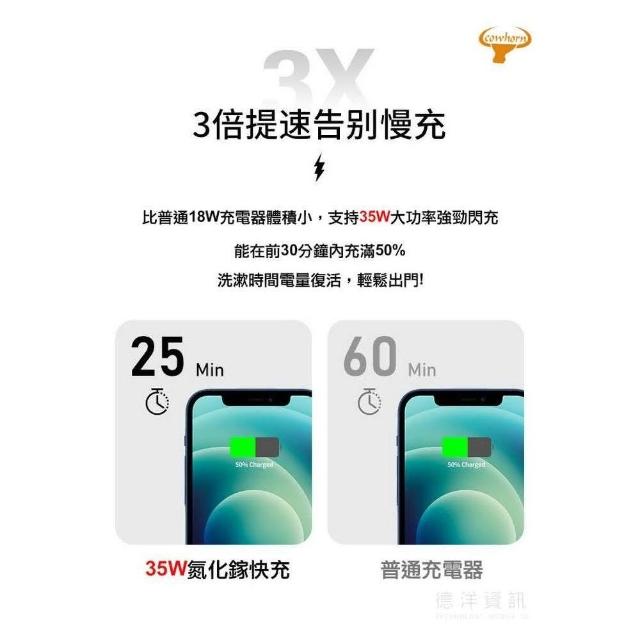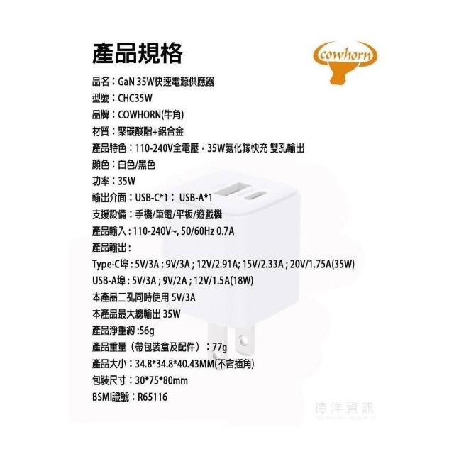 Cowhorn 高宏 35W氮化鎵 PD+QC 3.0快充 雙孔旅充頭 充電器 充電頭(充電頭)