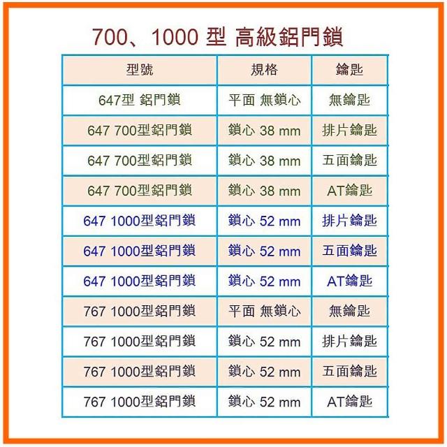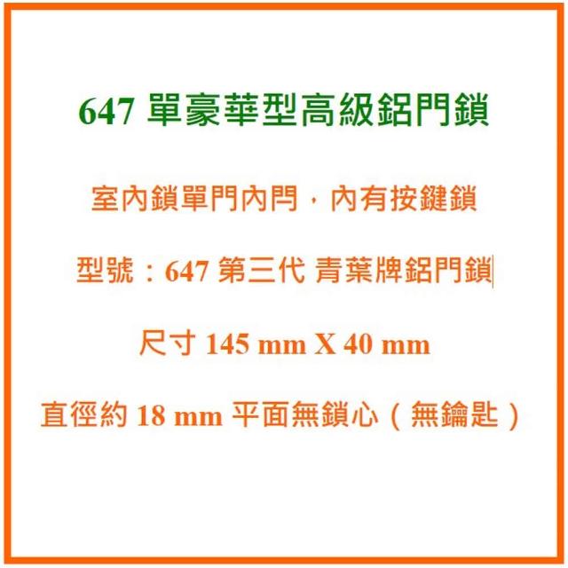 青葉647單向高級鋁門鎖 700/1000型 平面無鎖心 鋁門平鎖(無鑰匙 落地門鎖 推拉門鎖)