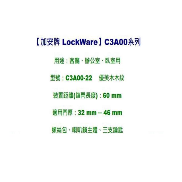 加安牌LockWar 木紋喇叭鎖 閂長60mm(門厚32-46mm 附鑰匙)
