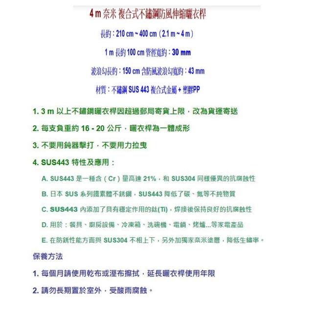 443不鏽鋼 伸縮曬衣桿 4米 2入(含防風波浪勾 晾衣桿)