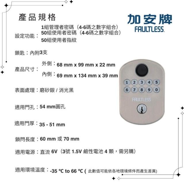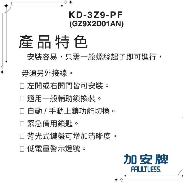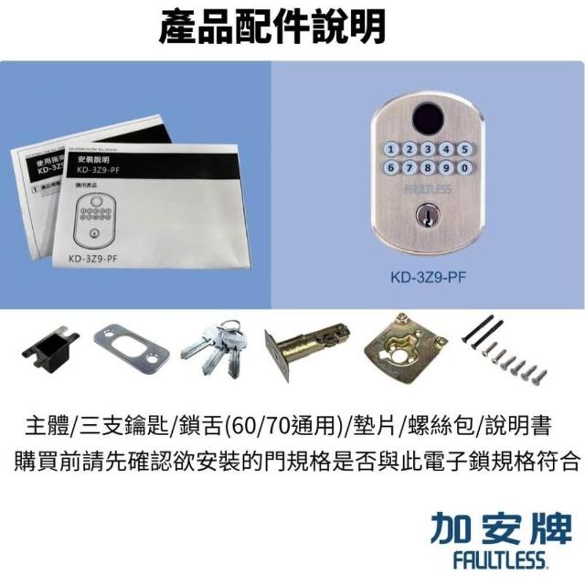 加安牌KD-3Z9-PF 三合一電子鎖 指紋 密碼 鑰匙 電子鎖 門鎖 輔助型 原廠保固 台灣製造