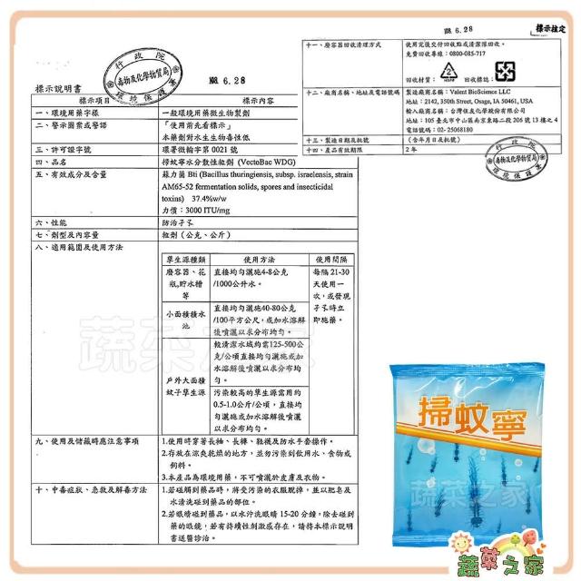 蔬菜之家掃蚊寧水分散性粒劑 防治孑孓 VectoBac WDG環署微輸字第0021號