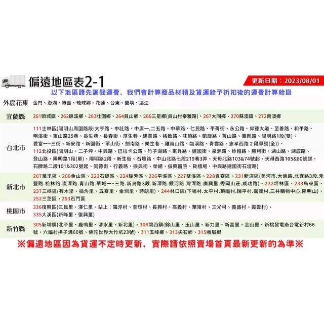 - 針對大型商品(包括:大型家電、家具床墊、健身按摩器材、車類...等),商店將於完成收款確認後,一天內〈不含例假日〉將會有專人與您確認相關配送細節等的聯繫。偏遠地區、樓層費及其它加價費用,皆由商店於約定配送時一併告知,商店將保留出貨與否的權利。
