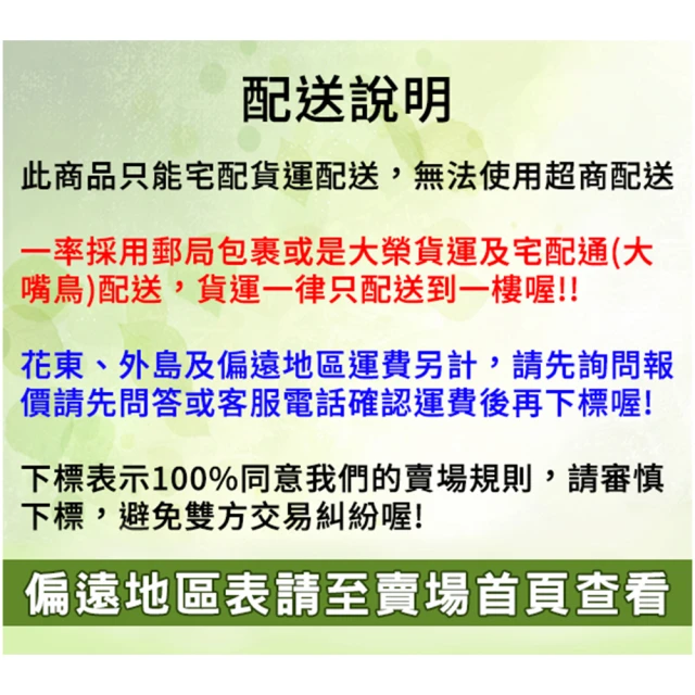 - 針對大型商品(包括:大型家電、家具床墊、健身按摩器材、車類...等),商店將於完成收款確認後,一天內〈不含例假日〉將會有專人與您確認相關配送細節等的聯繫。偏遠地區、樓層費及其它加價費用,皆由商店於約定配送時一併告知,商店將保留出貨與否的權利。