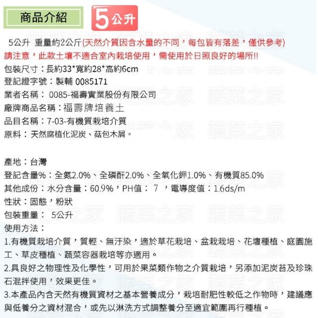 蔬菜之家福壽牌培養土 5公升栽培土.培養土.蔬菜土壤