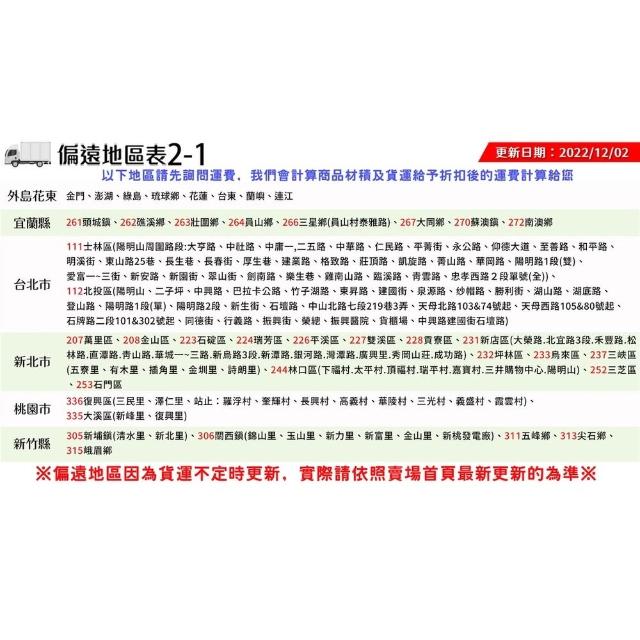 • 針對大型商品(包括:大型家電、家具床墊、健身按摩器材、車類...等),商店將於完成收款確認後,一天內〈不含例假日〉將會有專人與您確認相關配送細節等的聯繫。偏遠地區、樓層費及其它加價費用,皆由商店於約定配送時一併告知,商店將保留出貨與否的權利。