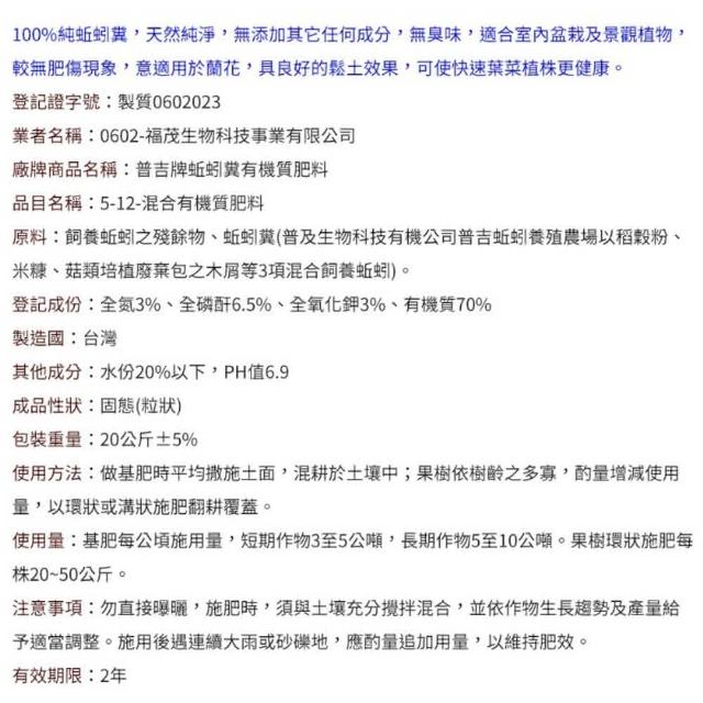 蔬菜之家普吉牌蚯蚓糞有機質肥料20公斤裝±5%粒狀蚯蚓肥 有機