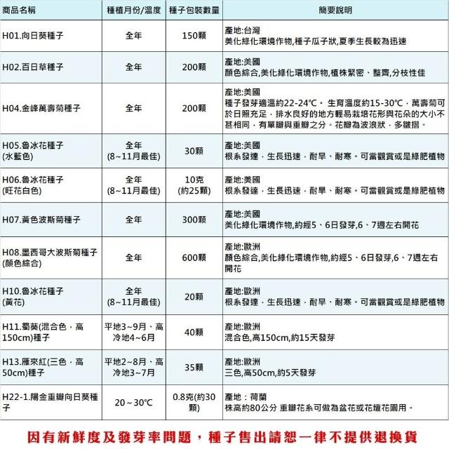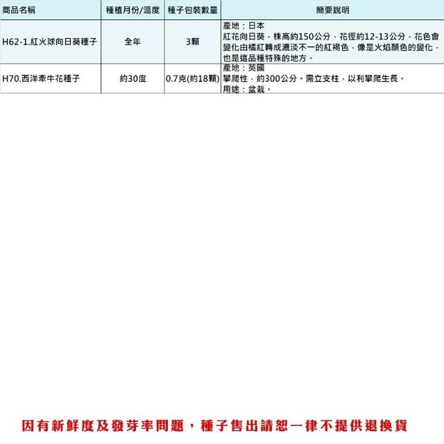 - 》客製化商品、特殊包裝商品、(土壤、介質、肥料不得拆封一經拆封請恕無法退換貨),種子因為有保存及發芽率問題,所以請恕一律不提供退換貨,若您可以接受再下單喔! 》園藝商品主要供應栽培大量使用,品質及規格的標示精緻度無法如店面看到實品標準,請會員多加留意,如無法同意者切勿下單購買喔! 》因有些土壤介質或商品原包裝標示不清楚,所以我們只能依據我們測量出來大約值標示,本站皆會儘量測量正確,使其儘量無誤差,而實際商品有時會因濕度或其他因素而導致容量(重量)與實際稍有落差,商品顏色也會因電腦畫質或解析度不同等因素而導致顏色不同,顏色以實際商品顏色為主,本站不接受容量(重量)、顏色不符等此原因退換貨,若無法同意者請勿購買喔!