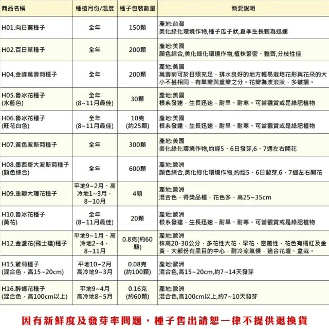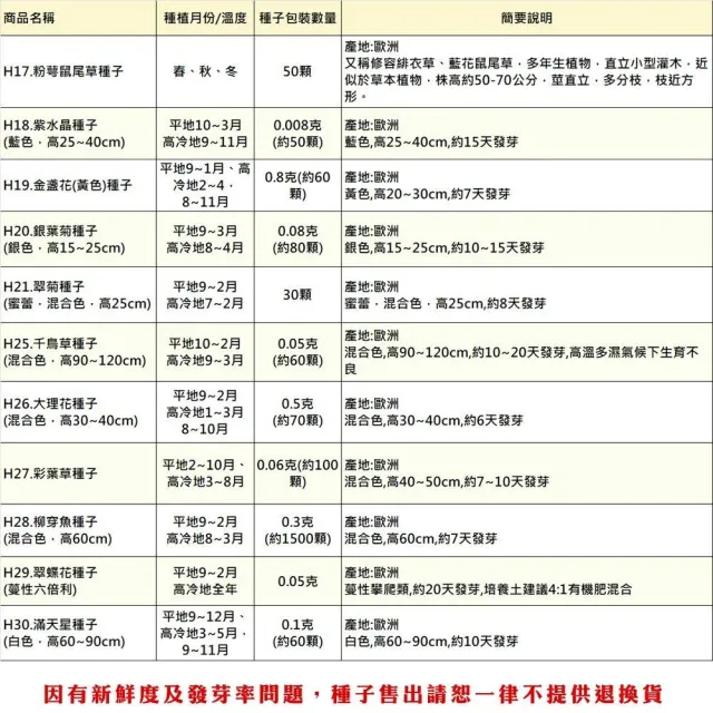 - 》客製化商品、特殊包裝商品、(土壤、介質、肥料不得拆封一經拆封請恕無法退換貨),種子因為有保存及發芽率問題,所以請恕一律不提供退換貨,若您可以接受再下單喔! 》園藝商品主要供應栽培大量使用,品質及規格的標示精緻度無法如店面看到實品標準,請會員多加留意,如無法同意者切勿下單購買喔! 》因有些土壤介質或商品原包裝標示不清楚,所以我們只能依據我們測量出來大約值標示,本站皆會儘量測量正確,使其儘量無誤差,而實際商品有時會因濕度或其他因素而導致容量(重量)與實際稍有落差,商品顏色也會因電腦畫質或解析度不同等因素而導致顏色不同,顏色以實際商品顏色為主,本站不接受容量(重量)、顏色不符等此原因退換貨,若無法同意者請勿購買喔!