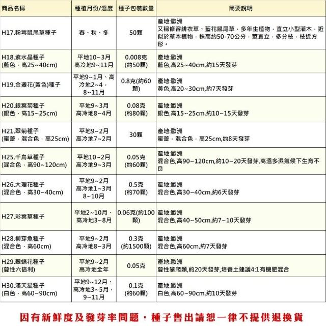 • 》客製化商品、特殊包裝商品、(土壤、介質、肥料不得拆封一經拆封請恕無法退換貨),種子因為有保存及發芽率問題,所以請恕一律不提供退換貨,若您可以接受再下單喔! 》園藝商品主要供應栽培大量使用,品質及規格的標示精緻度無法如店面看到實品標準,請會員多加留意,如無法同意者切勿下單購買喔! 》因有些土壤介質或商品原包裝標示不清楚,所以我們只能依據我們測量出來大約值標示,本站皆會儘量測量正確,使其儘量無誤差,而實際商品有時會因濕度或其他因素而導致容量(重量)與實際稍有落差,商品顏色也會因電腦畫質或解析度不同等因素而導致顏色不同,顏色以實際商品顏色為主,本站不接受容量(重量)、顏色不符等此原因退換貨,若無法同意者請勿購買喔!