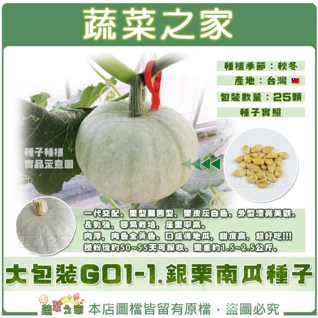 蔬菜之家大包裝G01-1.銀栗南瓜種子 25顆一代交配。果型扁圓型,果皮灰白色。外型漂亮美觀。