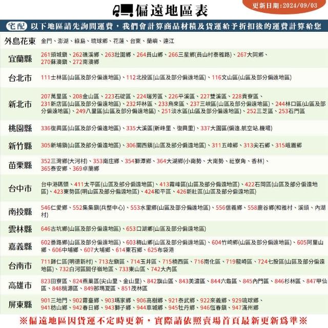 - 針對大型商品(包括:大型家電、家具床墊、健身按摩器材、車類...等),商店將於完成收款確認後,一天內〈不含例假日〉將會有專人與您確認相關配送細節等的聯繫。偏遠地區、樓層費及其它加價費用,皆由商店於約定配送時一併告知,商店將保留出貨與否的權利。