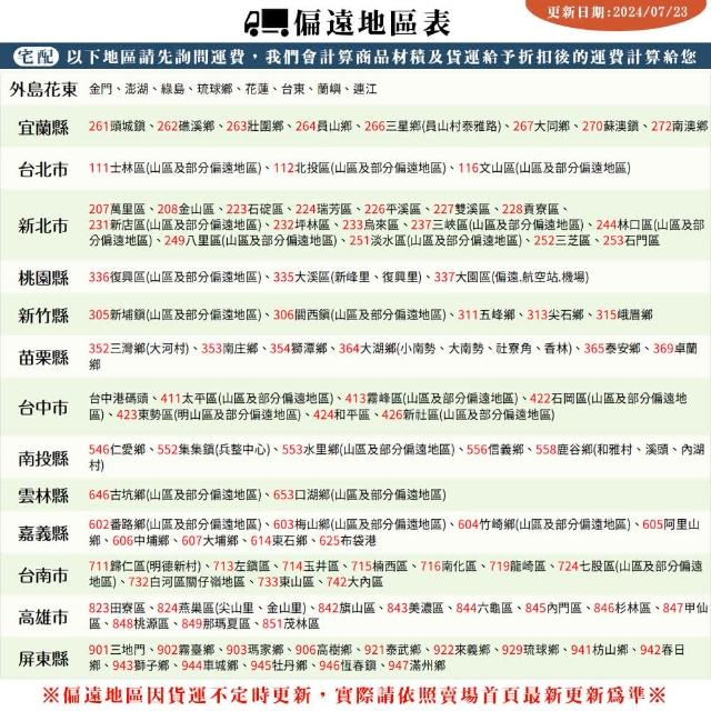 - 針對大型商品(包括:大型家電、家具床墊、健身按摩器材、車類...等),商店將於完成收款確認後,一天內〈不含例假日〉將會有專人與您確認相關配送細節等的聯繫。偏遠地區、樓層費及其它加價費用,皆由商店於約定配送時一併告知,商店將保留出貨與否的權利。