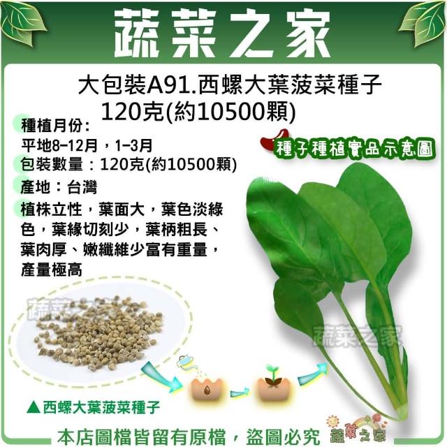 蔬菜之家大包裝A91.西螺大葉菠菜種子120克(約10500顆) //植株立性,葉面大,葉色淡綠色,葉緣切刻少,葉柄粗長、葉肉厚