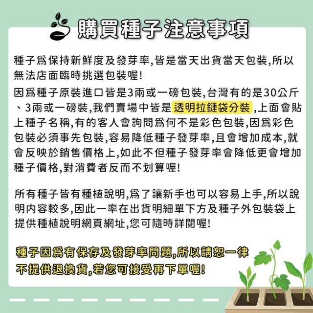 - 》客製化商品、特殊包裝商品、(土壤、介質、肥料不得拆封一經拆封請恕無法退換貨),種子因為有保存及發芽率問題,所以請恕一律不提供退換貨,若您可以接受再下單喔! 》園藝商品主要供應栽培大量使用,品質及規格的標示精緻度無法如店面看到實品標準,請會員多加留意,如無法同意者切勿下單購買喔! 》因有些土壤介質或商品原包裝標示不清楚,所以我們只能依據我們測量出來大約值標示,本站皆會儘量測量正確,使其儘量無誤差,而實際商品有時會因濕度或其他因素而導致容量(重量)與實際稍有落差,商品顏色也會因電腦畫質或解析度不同等因素而導致顏色不同,顏色以實際商品顏色為主,本站不接受容量(重量)、顏色不符等此原因退換貨,若無法同意者請勿購買喔!