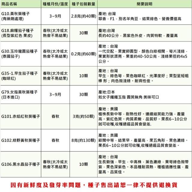 - 》客製化商品、特殊包裝商品、(土壤、介質、肥料不得拆封一經拆封請恕無法退換貨),種子因為有保存及發芽率問題,所以請恕一律不提供退換貨,若您可以接受再下單喔! 》園藝商品主要供應栽培大量使用,品質及規格的標示精緻度無法如店面看到實品標準,請會員多加留意,如無法同意者切勿下單購買喔! 》因有些土壤介質或商品原包裝標示不清楚,所以我們只能依據我們測量出來大約值標示,本站皆會儘量測量正確,使其儘量無誤差,而實際商品有時會因濕度或其他因素而導致容量(重量)與實際稍有落差,商品顏色也會因電腦畫質或解析度不同等因素而導致顏色不同,顏色以實際商品顏色為主,本站不接受容量(重量)、顏色不符等此原因退換貨,若無法同意者請勿購買喔!