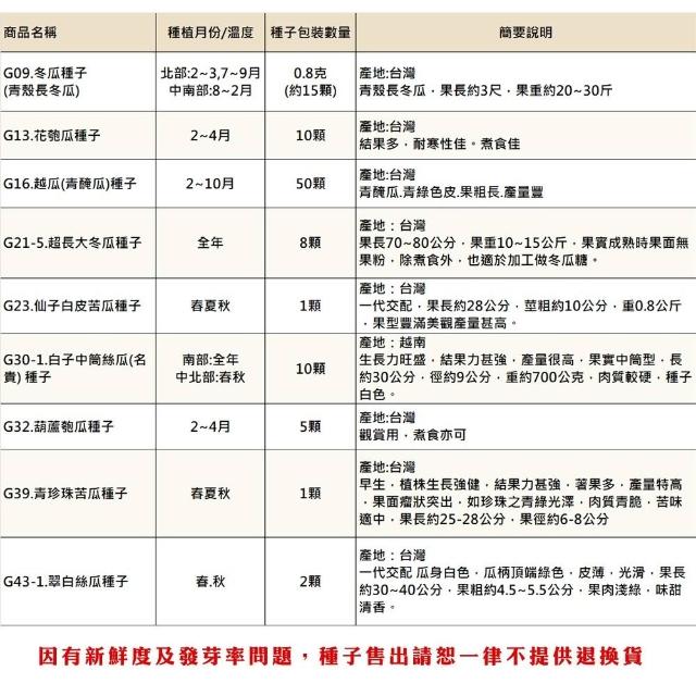 • 》客製化商品、特殊包裝商品、(土壤、介質、肥料不得拆封一經拆封請恕無法退換貨),種子因為有保存及發芽率問題,所以請恕一律不提供退換貨,若您可以接受再下單喔! 》園藝商品主要供應栽培大量使用,品質及規格的標示精緻度無法如店面看到實品標準,請會員多加留意,如無法同意者切勿下單購買喔! 》因有些土壤介質或商品原包裝標示不清楚,所以我們只能依據我們測量出來大約值標示,本站皆會儘量測量正確,使其儘量無誤差,而實際商品有時會因濕度或其他因素而導致容量(重量)與實際稍有落差,商品顏色也會因電腦畫質或解析度不同等因素而導致顏色不同,顏色以實際商品顏色為主,本站不接受容量(重量)、顏色不符等此原因退換貨,若無法同意者請勿購買喔!