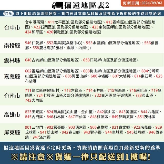- 針對大型商品(包括:大型家電、家具床墊、健身按摩器材、車類...等),商店將於完成收款確認後,一天內〈不含例假日〉將會有專人與您確認相關配送細節等的聯繫。偏遠地區、樓層費及其它加價費用,皆由商店於約定配送時一併告知,商店將保留出貨與否的權利。
