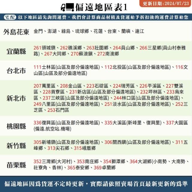 - 針對大型商品(包括:大型家電、家具床墊、健身按摩器材、車類...等),商店將於完成收款確認後,一天內〈不含例假日〉將會有專人與您確認相關配送細節等的聯繫。偏遠地區、樓層費及其它加價費用,皆由商店於約定配送時一併告知,商店將保留出貨與否的權利。