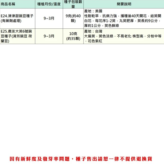 - 》客製化商品、特殊包裝商品、(土壤、介質、肥料不得拆封一經拆封請恕無法退換貨),種子因為有保存及發芽率問題,所以請恕一律不提供退換貨,若您可以接受再下單喔! 》園藝商品主要供應栽培大量使用,品質及規格的標示精緻度無法如店面看到實品標準,請會員多加留意,如無法同意者切勿下單購買喔! 》因有些土壤介質或商品原包裝標示不清楚,所以我們只能依據我們測量出來大約值標示,本站皆會儘量測量正確,使其儘量無誤差,而實際商品有時會因濕度或其他因素而導致容量(重量)與實際稍有落差,商品顏色也會因電腦畫質或解析度不同等因素而導致顏色不同,顏色以實際商品顏色為主,本站不接受容量(重量)、顏色不符等此原因退換貨,若無法同意者請勿購買喔!