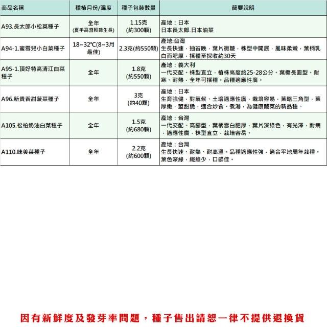 蔬菜之家全年可栽培 短期收成葉菜類種子系列 (各種包裝數量詳見內文及圖片) 青江菜 白菜 芥藍菜 空心菜種子