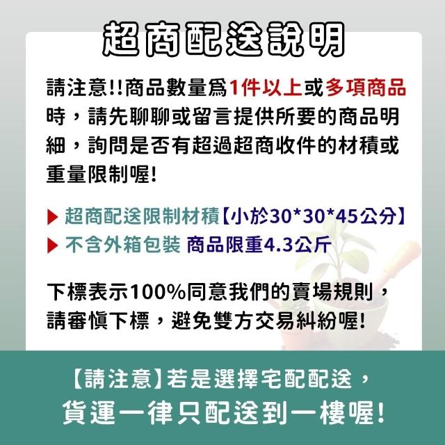 - 》客製化商品、特殊包裝商品、(土壤、介質、肥料不得拆封一經拆封請恕無法退換貨),種子因為有保存及發芽率問題,所以請恕一律不提供退換貨,若您可以接受再下單喔! 》園藝商品主要供應栽培大量使用,品質及規格的標示精緻度無法如店面看到實品標準,請會員多加留意,如無法同意者切勿下單購買喔! 》因有些土壤介質或商品原包裝標示不清楚,所以我們只能依據我們測量出來大約值標示,本站皆會儘量測量正確,使其儘量無誤差,而實際商品有時會因濕度或其他因素而導致容量(重量)與實際稍有落差,商品顏色也會因電腦畫質或解析度不同等因素而導致顏色不同,顏色以實際商品顏色為主,本站不接受容量(重量)、顏色不符等此原因退換貨,若無法同意者請勿購買喔!