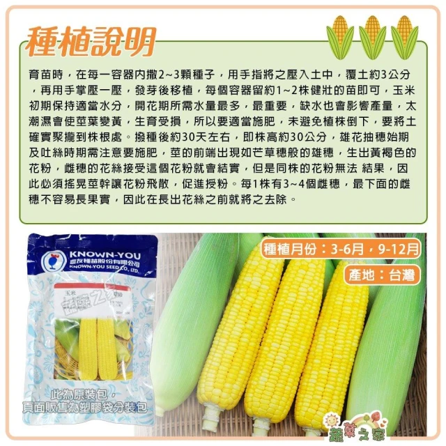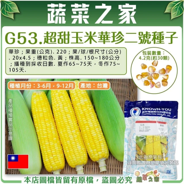 蔬菜之家G53.超甜玉米華珍二號種子4.2克約30顆華珍 ; 果重公克. 220 ; 果球根尺寸