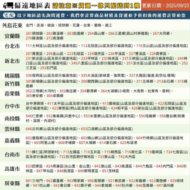 - 針對大型商品(包括:大型家電、家具床墊、健身按摩器材、車類...等),商店將於完成收款確認後,一天內〈不含例假日〉將會有專人與您確認相關配送細節等的聯繫。偏遠地區、樓層費及其它加價費用,皆由商店於約定配送時一併告知,商店將保留出貨與否的權利。