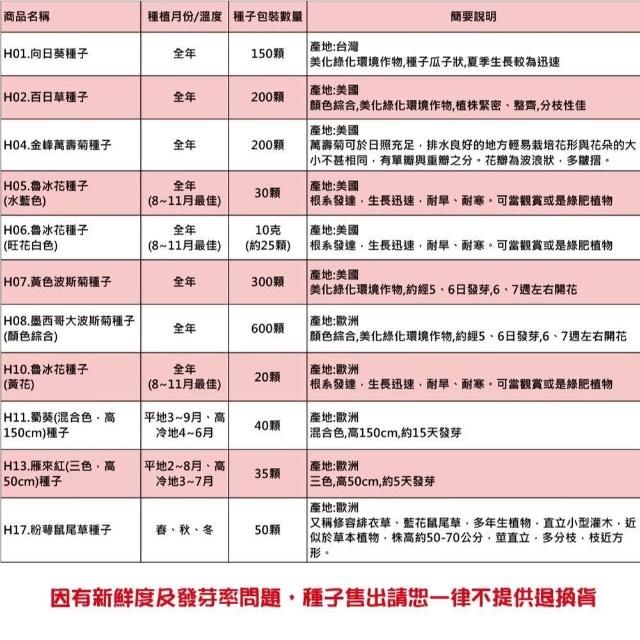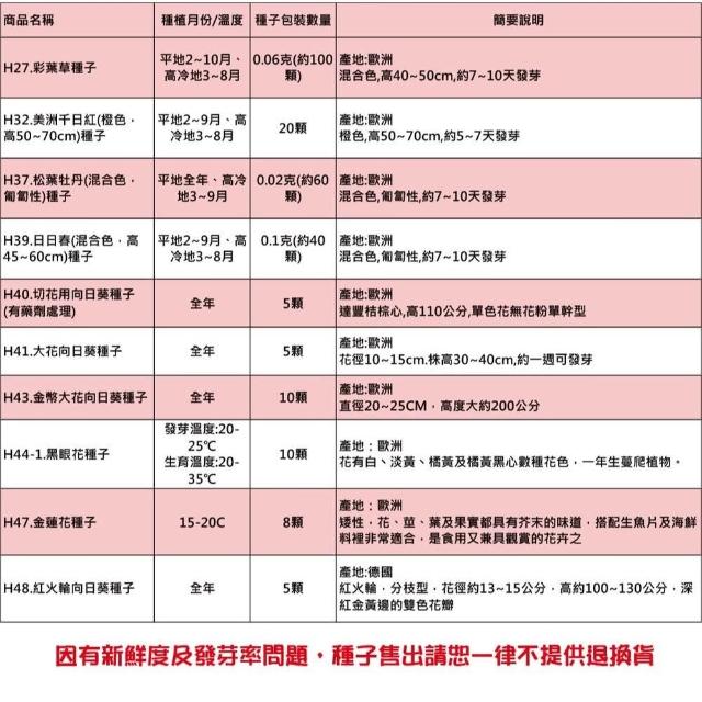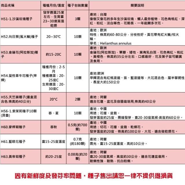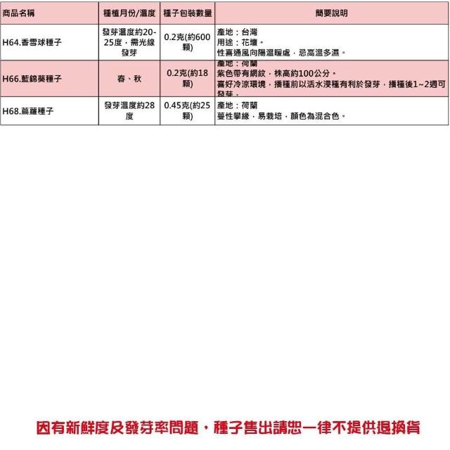 - 》客製化商品、特殊包裝商品、(土壤、介質、肥料不得拆封一經拆封請恕無法退換貨),種子因為有保存及發芽率問題,所以請恕一律不提供退換貨,若您可以接受再下單喔! 》園藝商品主要供應栽培大量使用,品質及規格的標示精緻度無法如店面看到實品標準,請會員多加留意,如無法同意者切勿下單購買喔! 》因有些土壤介質或商品原包裝標示不清楚,所以我們只能依據我們測量出來大約值標示,本站皆會儘量測量正確,使其儘量無誤差,而實際商品有時會因濕度或其他因素而導致容量(重量)與實際稍有落差,商品顏色也會因電腦畫質或解析度不同等因素而導致顏色不同,顏色以實際商品顏色為主,本站不接受容量(重量)、顏色不符等此原因退換貨,若無法同意者請勿購買喔!