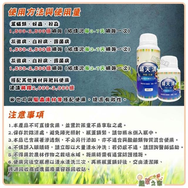 蔬菜之家蟎天清250cc、500cc 防除害蟲、病菌用 蟎類 粉蝨 蚜蟲 粉介殼蟲 薊馬 紅蜘蛛 葉螨 二點
