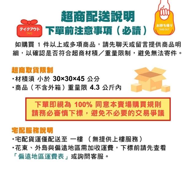 - 針對大型商品(包括:大型家電、家具床墊、健身按摩器材、車類...等),商店將於完成收款確認後,一天內〈不含例假日〉將會有專人與您確認相關配送細節等的聯繫。偏遠地區、樓層費及其它加價費用,皆由商店於約定配送時一併告知,商店將保留出貨與否的權利。