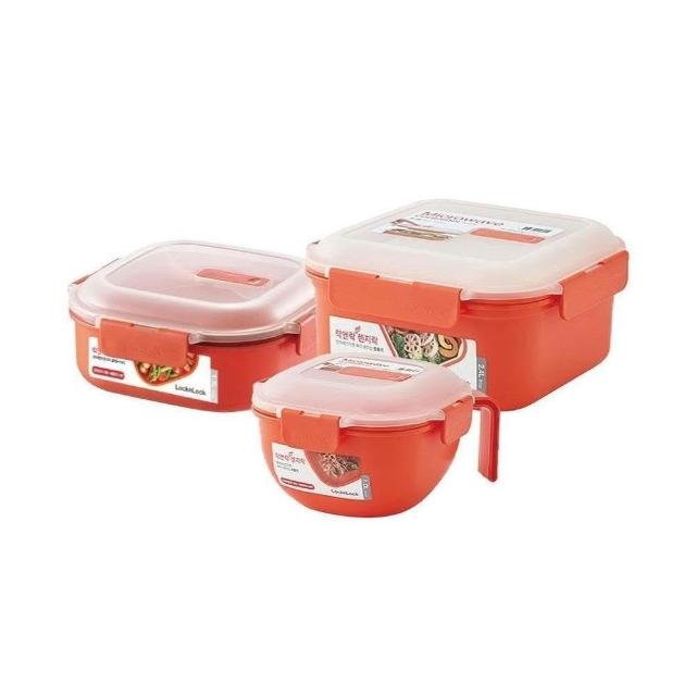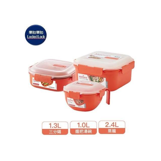 LocknLock 樂扣樂扣可蒸可煮PP微波專用保鮮盒/三入組-(1L握把湯碗+1.3L三分隔+2.4L蒸籠)-miffybaby
