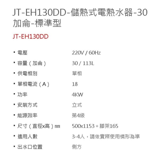 喜特麗JT-EH130DD 30加侖 儲熱式 電熱水器 直掛式 4KW 全省免運 限定區域送基本安裝