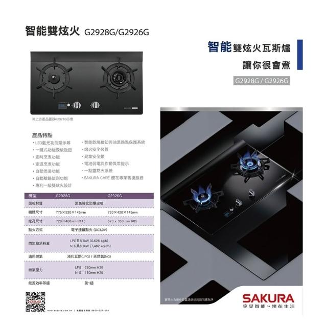 SAKURA 櫻花G2926G 智能雙炫火二口玻璃檯面爐 瓦斯爐 限定區域送基本安裝