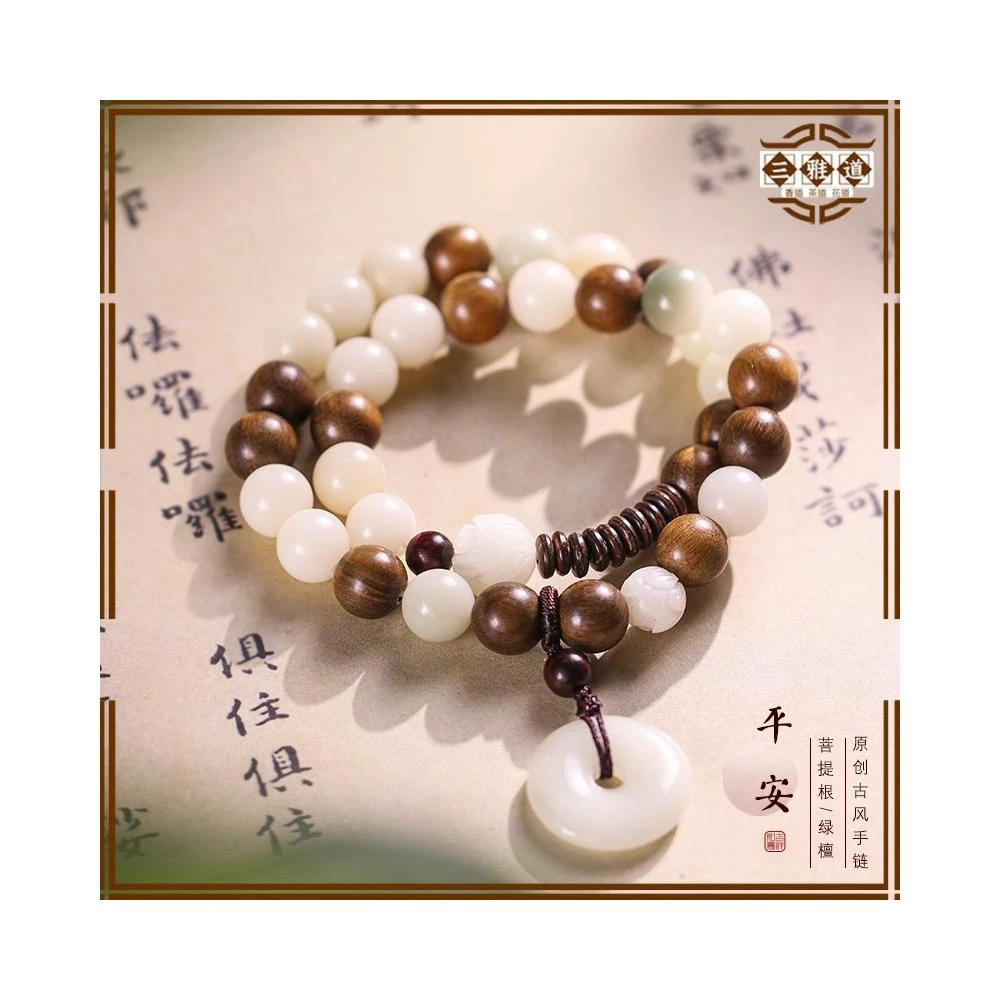 三雅道 創意艺文手鏈 風化菩提珠多寶平安扣 天然綠檀DIY手工編織 雙圈手串