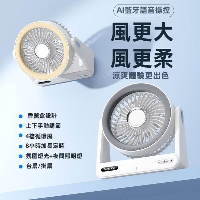 110V智能語音聲控桌面小風扇 充電風扇家用 便攜學生宿舍 帶香薰盒風扇 暖光照明燈 四擋柔風調節 持久續航 臺扇掛扇二
