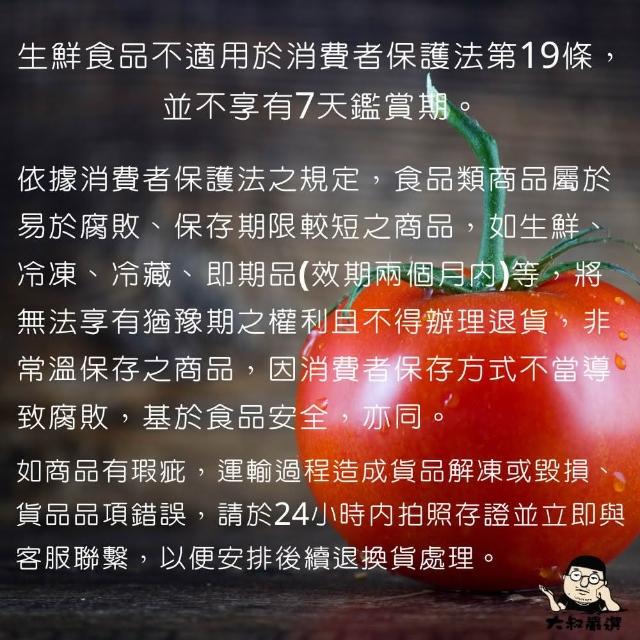 - 生鮮食品不適用於消費者保護法第19條,並不享有7天鑑賞期。 依據消費者保護法之規定,食品類商品屬於易於腐敗、保存期限較短之商品,如生鮮、冷凍、冷藏、即期品(效期兩個月內)等,將無法享有猶豫期之權利且不得辦理退貨,非常溫保存之商品,因消費者保存方式不當導致腐敗,基於食品安全,亦同。 如商品有瑕疵,運輸過程造成貨品解凍或毀損、貨品品項錯誤,請於24小時內拍照存證並立即與客服聯繫,以便安排後續退換貨處理。