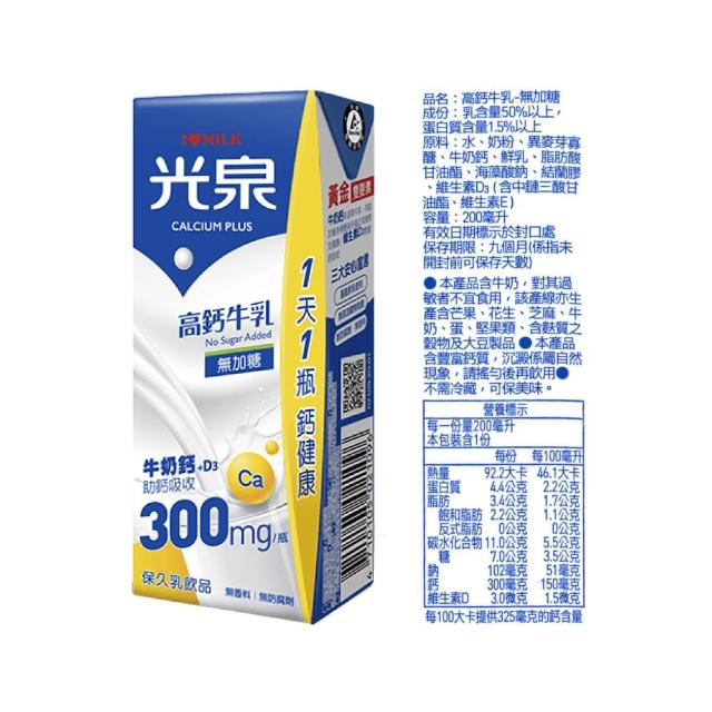 光泉光泉 高鈣牛乳無加糖 (保久乳) 200mLx24瓶/箱 【2031394】