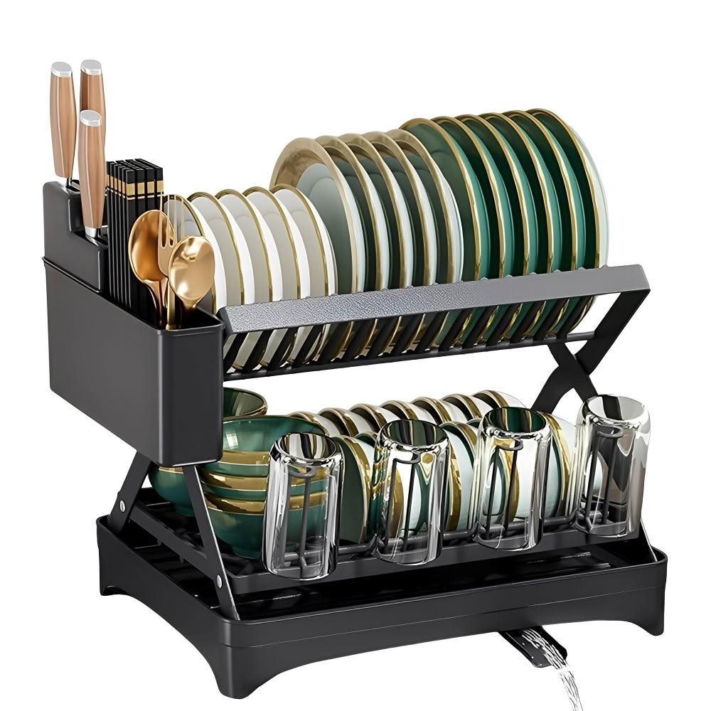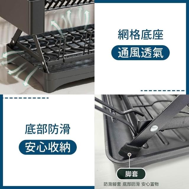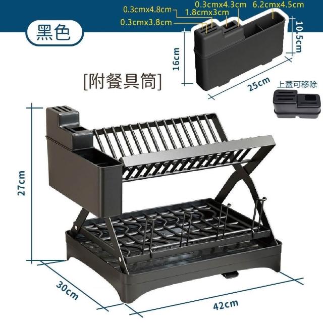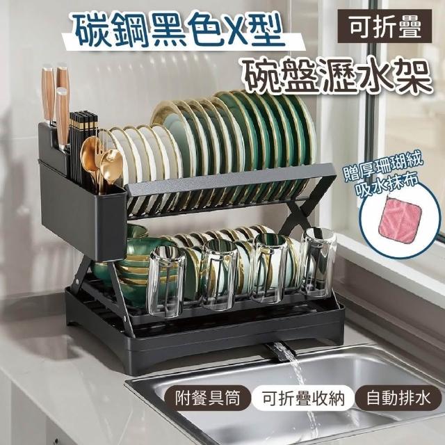 擎昀可折疊 碳鋼黑色X型雙層碗盤瀝水架 附餐具刀筒🎁送加厚抹布 碗盤瀝水架 瀝水碗架 碗盤收納架 廚房瀝水架