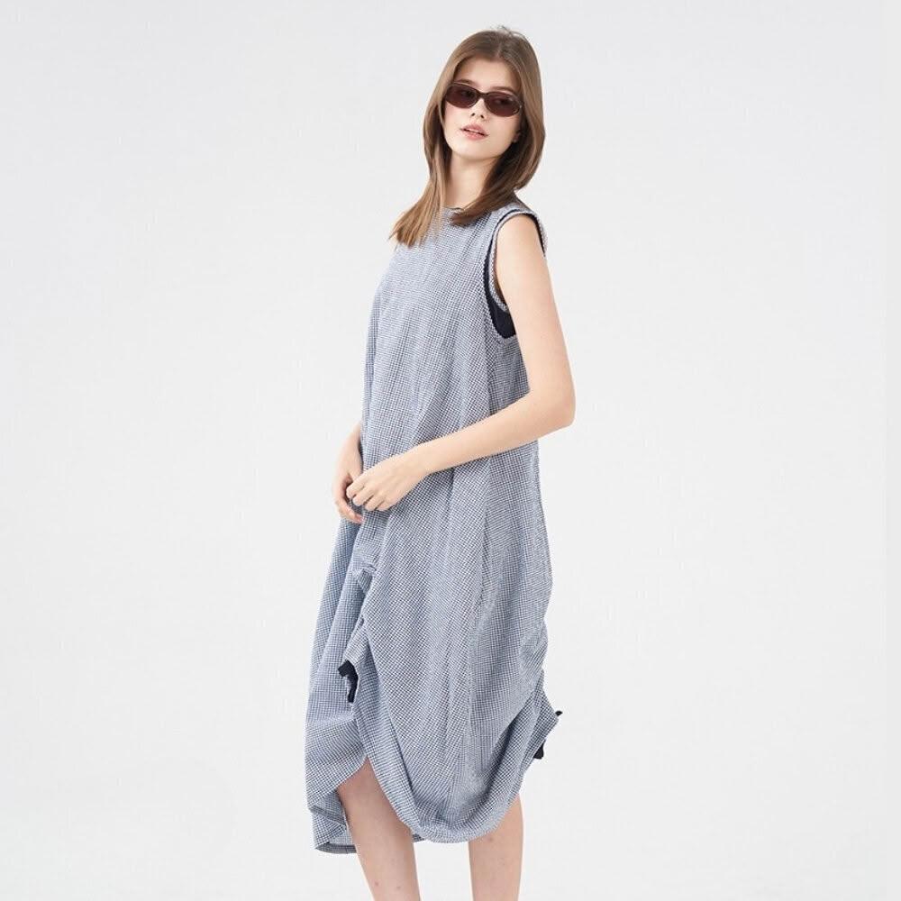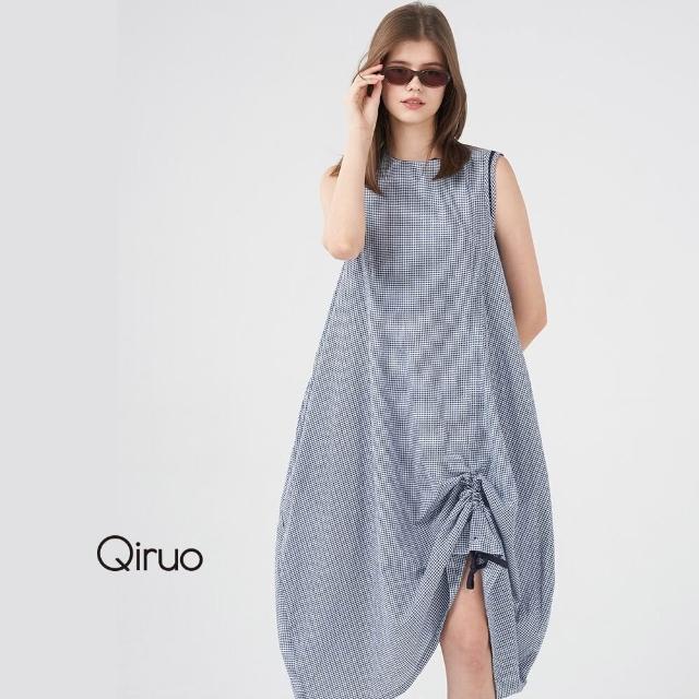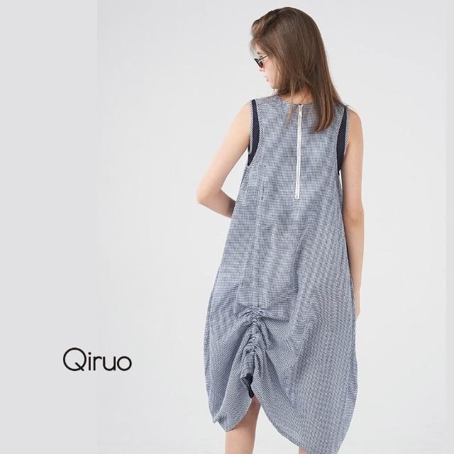 Qiruo 奇若名品春夏專櫃藍白細格洋裝8256F小傘狀抓皺設計