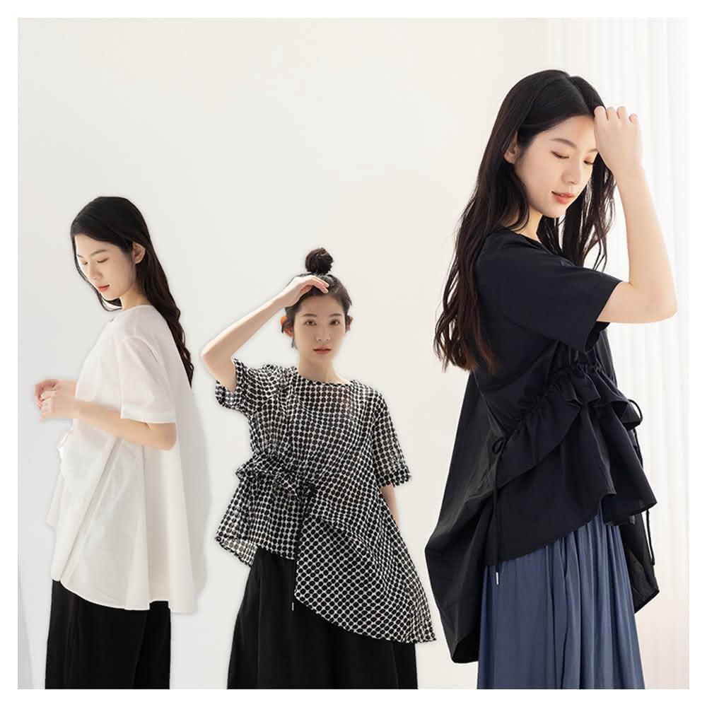 不對稱荷葉斜襬剪裁圓領短袖上衣