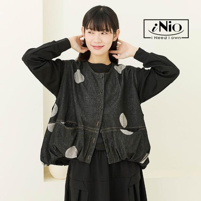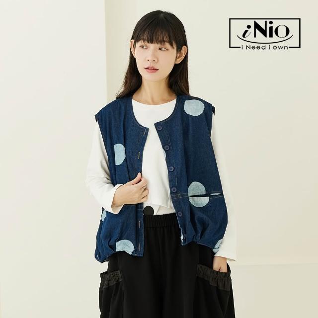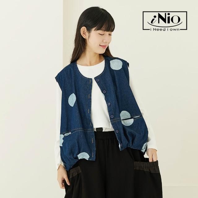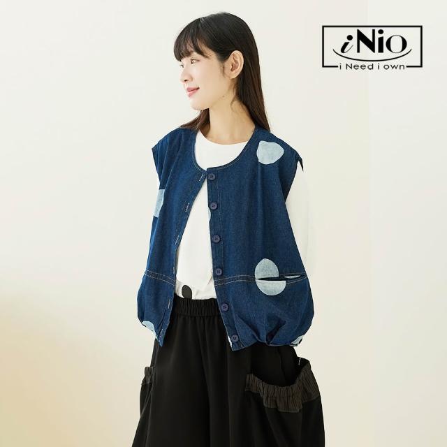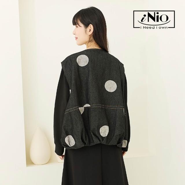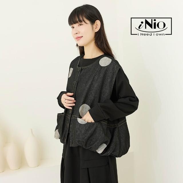 iNio 衣著美學舒適丹寧風 大口袋背心外套 撞色圓紋 U型領背心外套 CEW4812