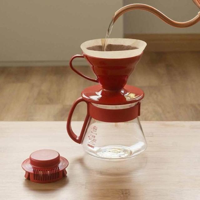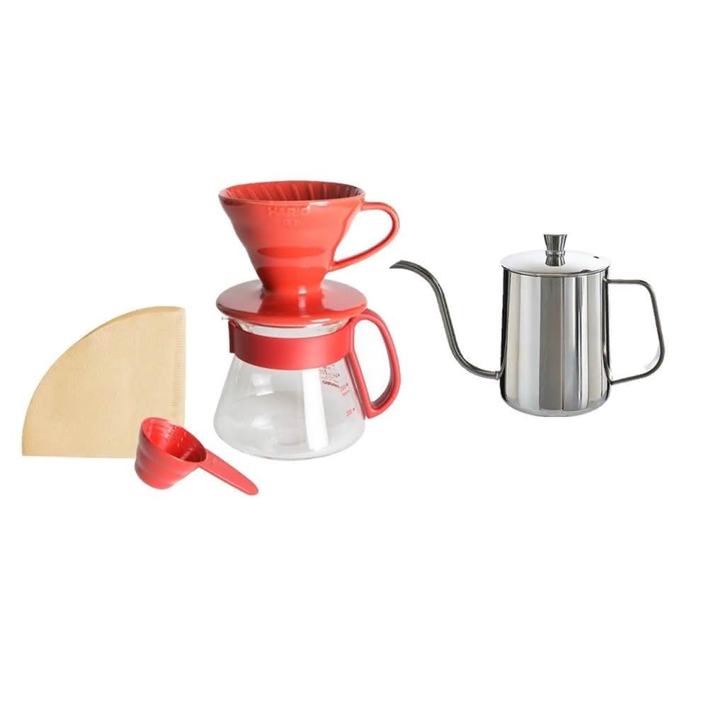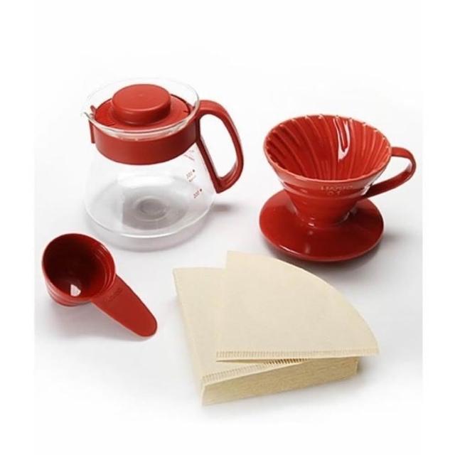 HARIOV60紅色陶瓷濾杯咖啡壺組+不鏽鋼手沖壺 600ml 細口長嘴壺 附濾紙濾杯1-2杯 咖啡壺360ml 禮盒組