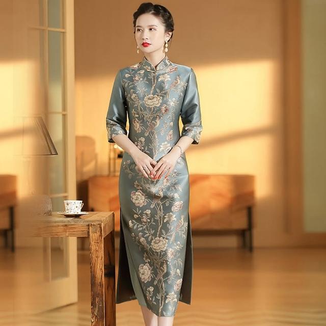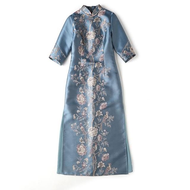 巴黎精品現貨+預購 女新中式旗袍連身裙改良旗袍A字裙中長裙大碼洋裝休閒大尺碼女裝(七分袖花鳥立領女裙子2色p1bf25)