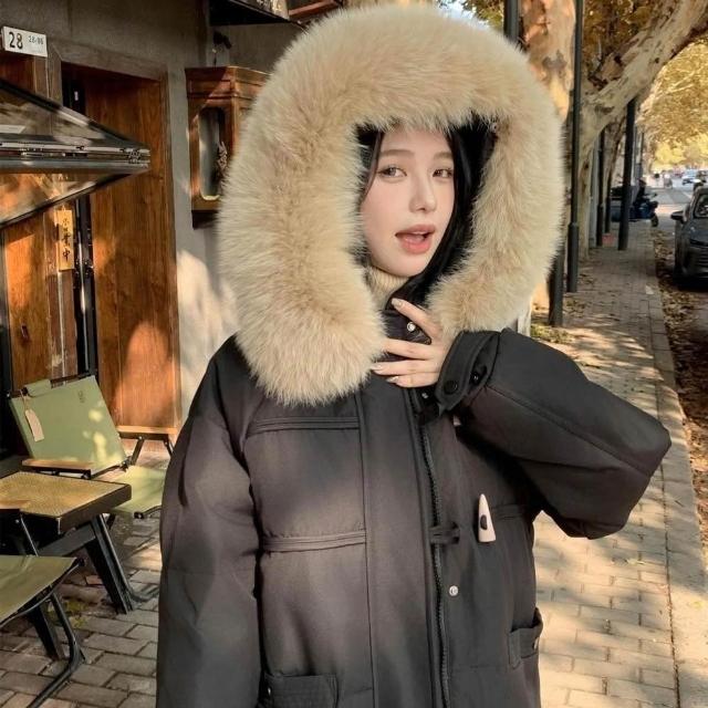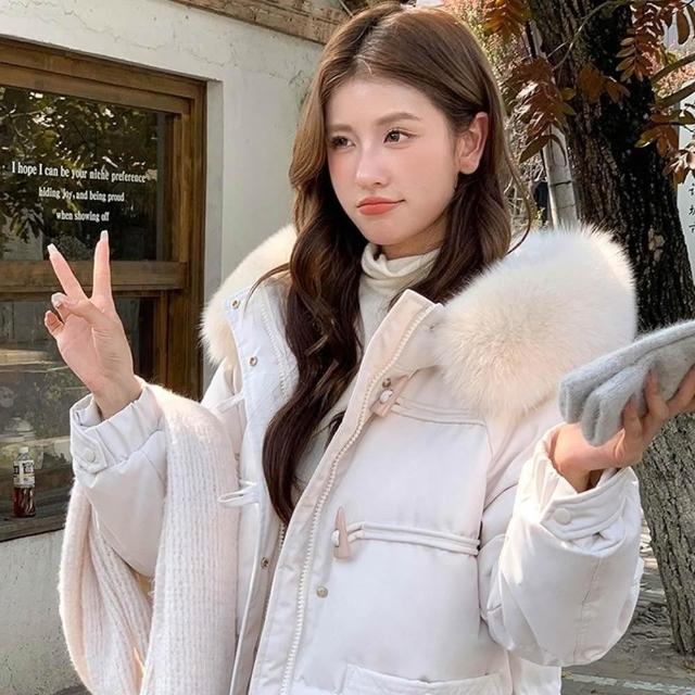 巴黎精品現貨+預購 真羽絨90%白鴨絨真狐狸毛領羽絨衣羽絨外套-保暖牛角扣連帽女外套4色a1do48