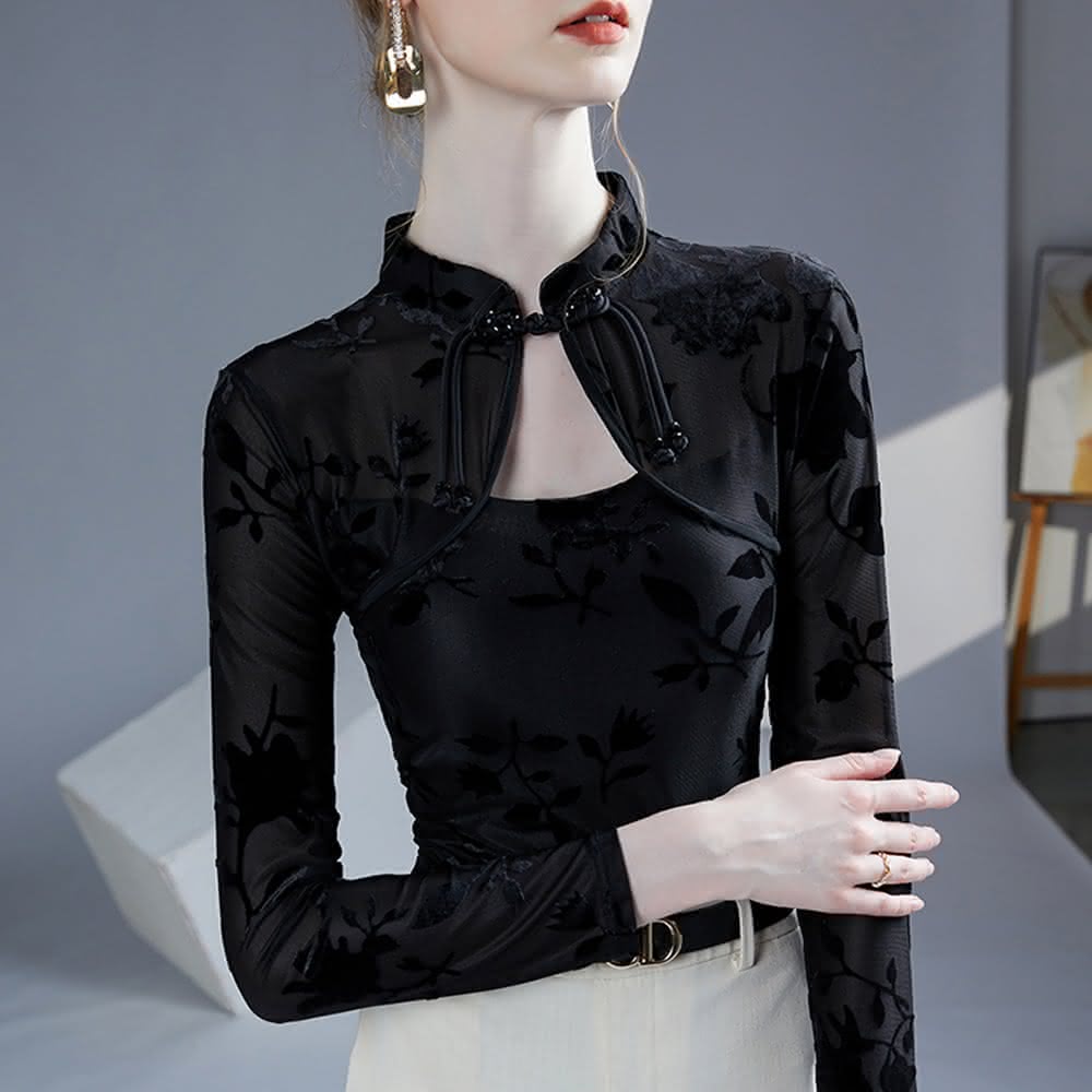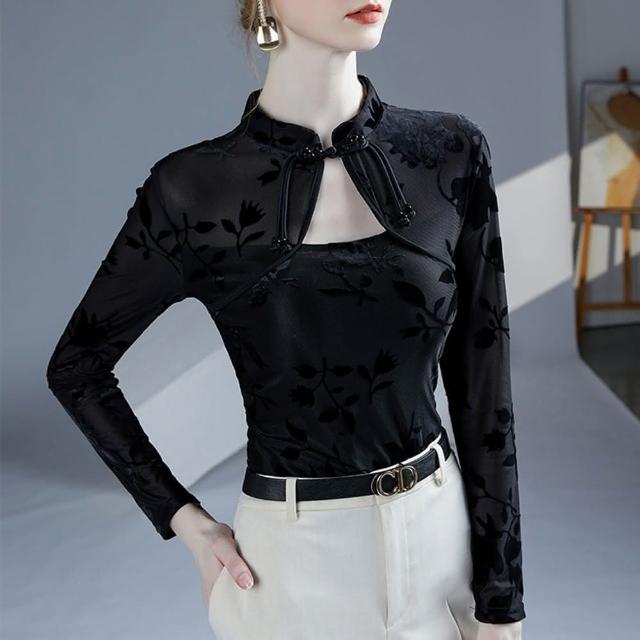 巴黎精品現貨+預購 新中式T恤長袖上衣提花鏤空盤扣旗袍女裝a1fs4