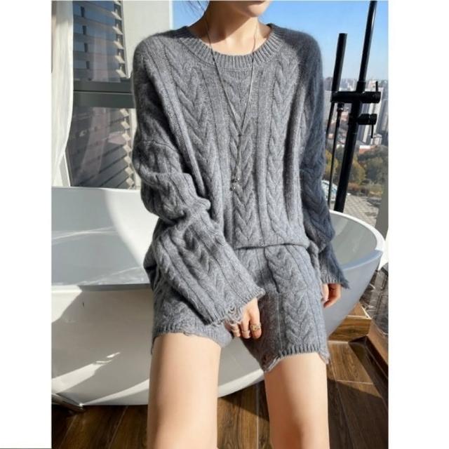 巴黎精品現貨+預購 100%羊毛套裝針織休閒服-保暖圓領破洞麻花毛衣+針織短褲女裝4色a1id60