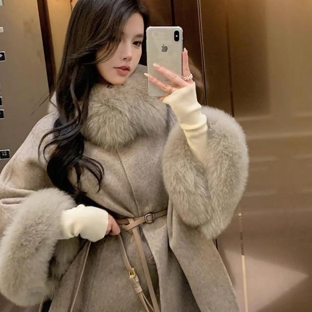 巴黎精品現貨+預購 羊毛大衣毛呢外套-保暖狐狸毛領中長版斗篷高級女外套3色a1ik2
