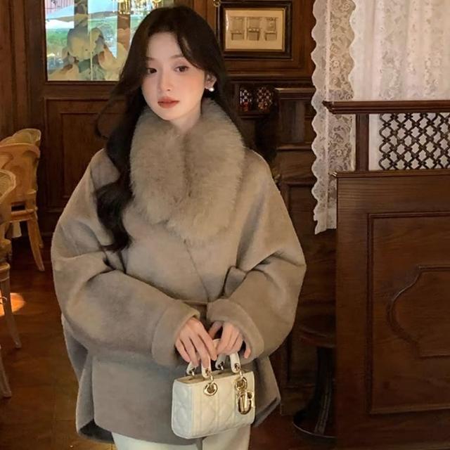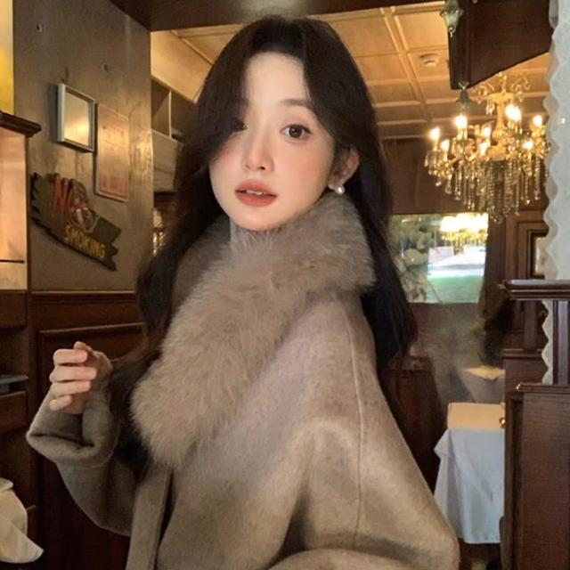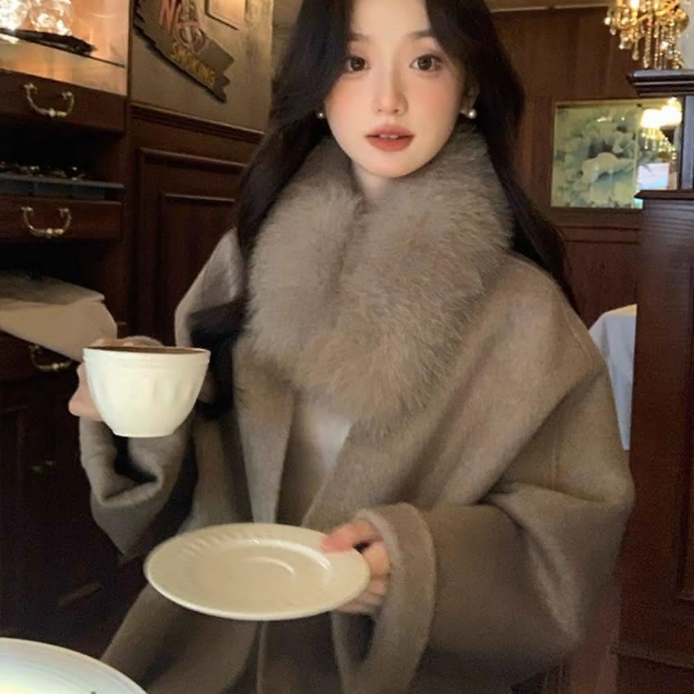 巴黎精品現貨+預購 羊毛大衣毛呢外套-保暖狐狸毛圍巾雙面絨寬鬆氣質名流女外套灰色a1ik48